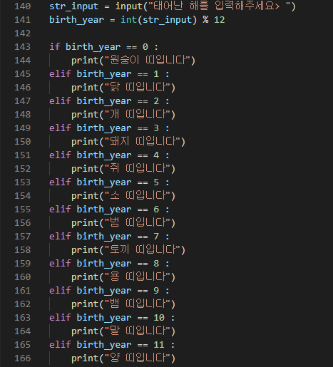 143줄~) elif문을 통해 birth_year가 0일 때, 1일 때, 2일 때, ... , 11일 때 무슨 띠인지 출력하도록 한다.