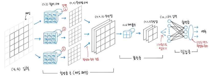 - 합성곱의 필터는 3개, 각각 (3,3) 크기 가중치를 가지고 있고 필터마다 절편이 하나씩 있다.