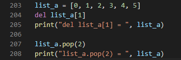 207줄) 리스트의 2번째 요소를 제거한다. del로 list_a의 요소가 0, 2, 3, 4, 5가 되었다. 이 리스트에서 2번째 요소인 3이 제거되는 것이다.