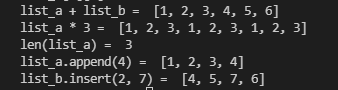 이상하게도 visual studio code에서 print("list_a.append(4) = ", list_a.append(4)) 이렇게 써보니 결과가 None이라고 출력되었다. print("list_b.insert(2, 7) = ", list_b.insert(2, 7))의 결과도 None이라고 출력된다.