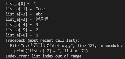 187번째 줄 보면 인덱스가 -7인데 이때 IndexError가 나타난다. 리스트의 길이를 넘어가는 요소를 선택하려고 하면 나타난다. 요소가 존재하지 않는 위치에서 요소를 꺼내려고 해서 나타나는 에러이다.