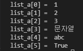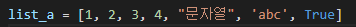 다른 언어에서는 자료형이 다르면 리스트에 쓸 수 없었던 것 같은데 (아닌가?) 파이썬은 다른 자료형인 요소들을 하나의 리스트에 쓸 수 있다.