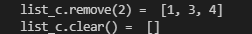 214줄) clear( )로 리스트의 모든 요소를 제거한다. 결과를 보면 []이라고 출력되는데 이는 요소가 모두 제거되었다는 의미이다.