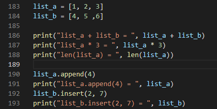 190줄) list_a에 요소 4를 추가하는 줄이다. 결과를 보면 list_a의 마지막 자리에 4가 추가된 것을 확인할 수 있다.