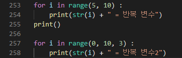 | 범위와 함께 for 반복문 사용 | for 숫자 변수 in 범위: 코드 |