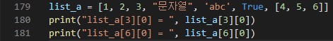 180번째 줄을 보면 3번째에 있는 "문자열" 요소의 0번째 요소에 접근하는 것이다.