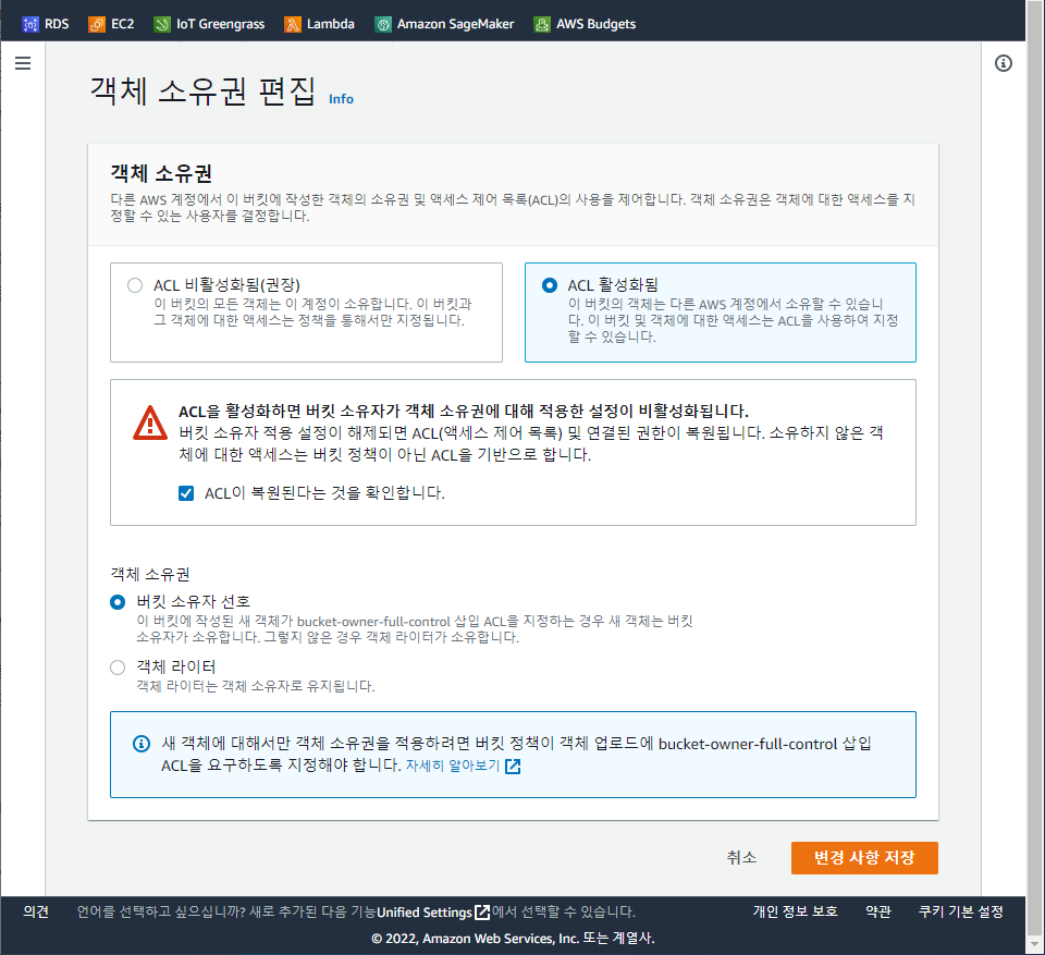 왜그러냐면 아까 버킷 생성시 ACL을 활성화 하지 않았기 때문 + 퍼블릭으로 설정하지 않았기 때문