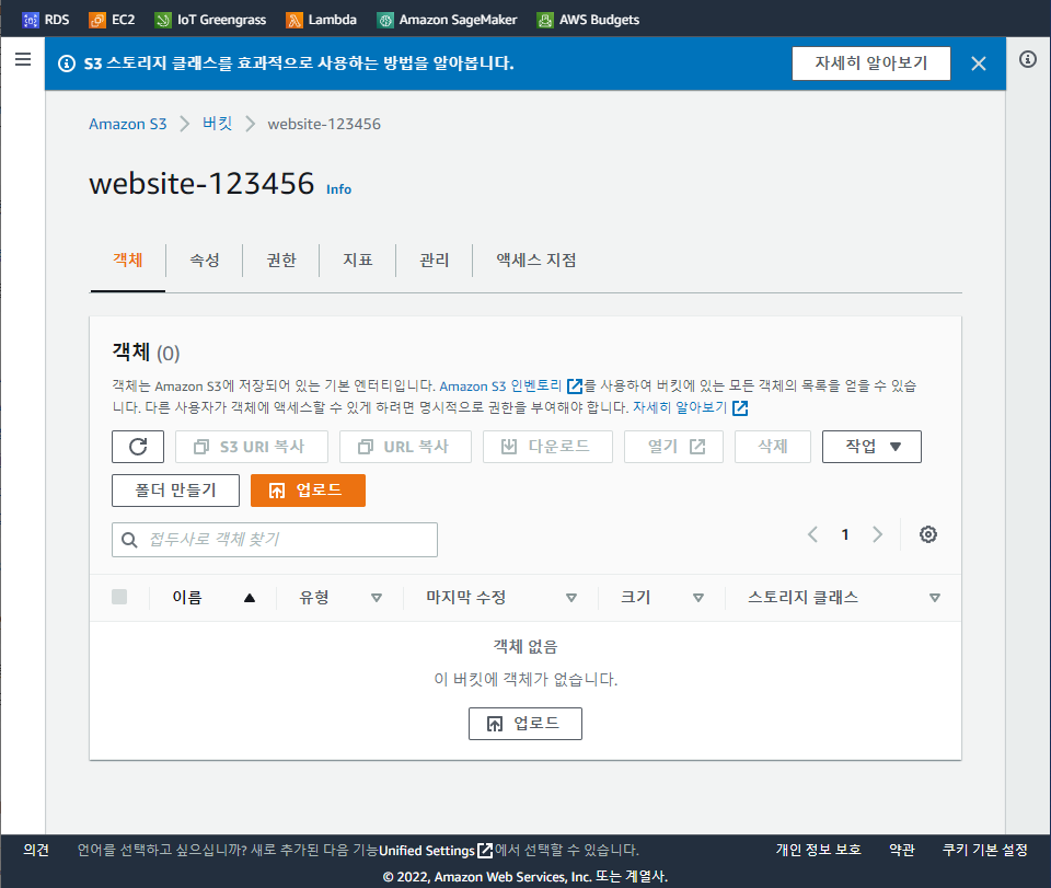 다음은 생성한 버킷을 들어가면 객체, 권한 머시기 저시기 책갈표가 있는데 거기에서 Properties에 들어간다