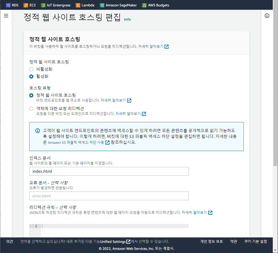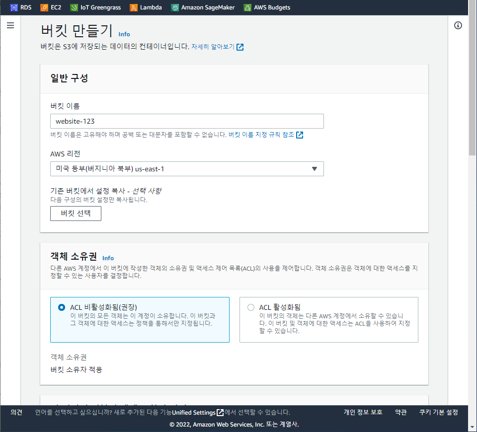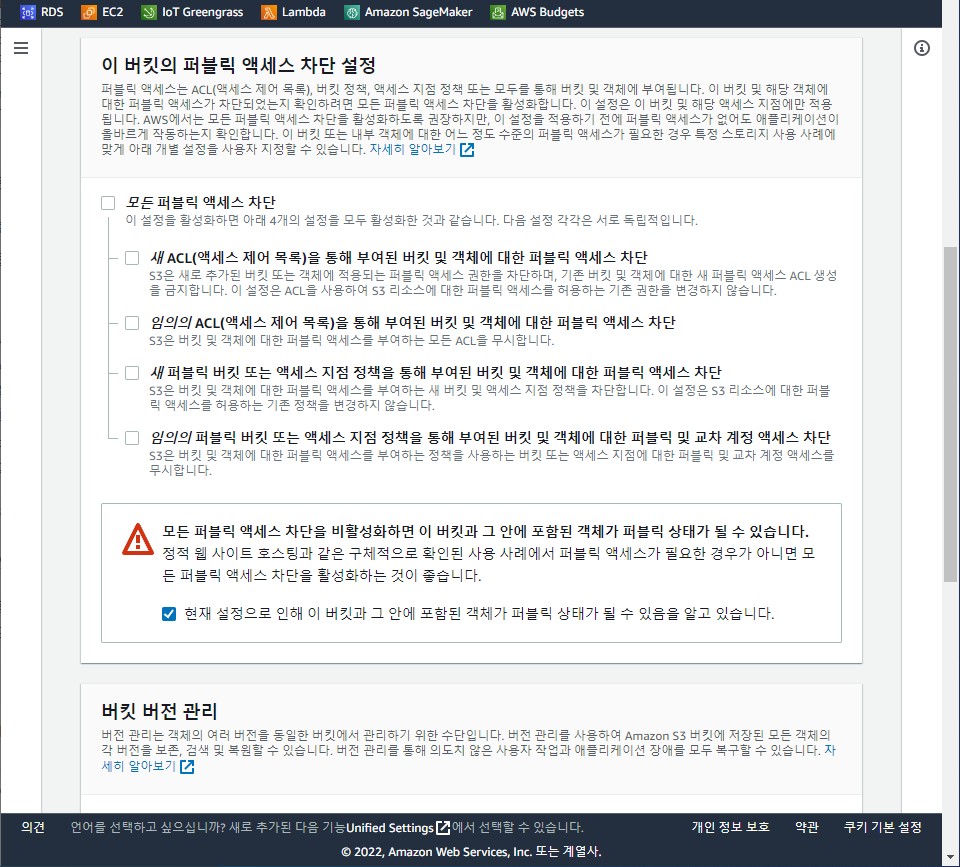 나머지는 기본 값으로 설정하고 페이지 맨 아래에 있는 버킷 생성 완료하기 같은 버튼을 누르면 된다