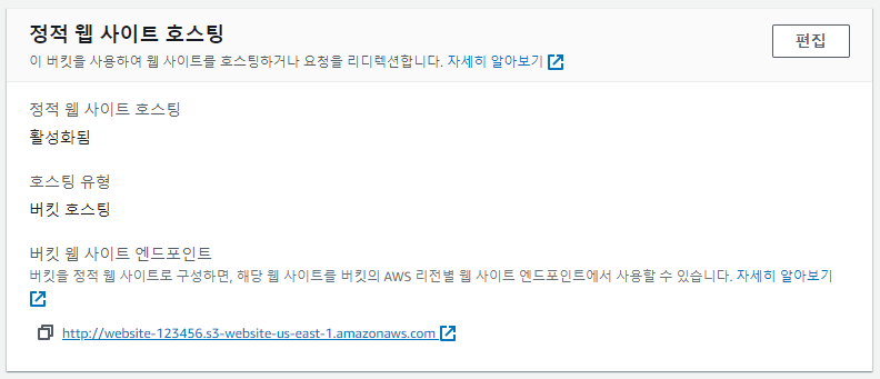 그리고 맨 밑으로 스크롤하면 [정적 웹 사이트 호스팅 편집]이라는 게 나오는데 그걸 클릭한다
