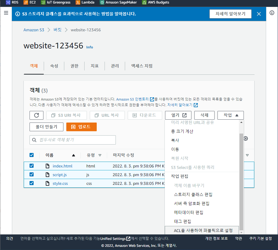 그리고 세 개의 파일을 모두 선택한 뒤 [작업] - [ACL을 사용하여 퍼블릭으로 설정]을 하면 된다