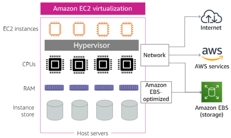 - 각 가상머신은 Amazon Linux, Microsoft Windows와 같은 OS를 운영