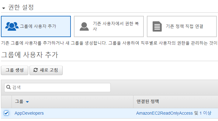 정책 넣고 AppDevelopers그룹 생성