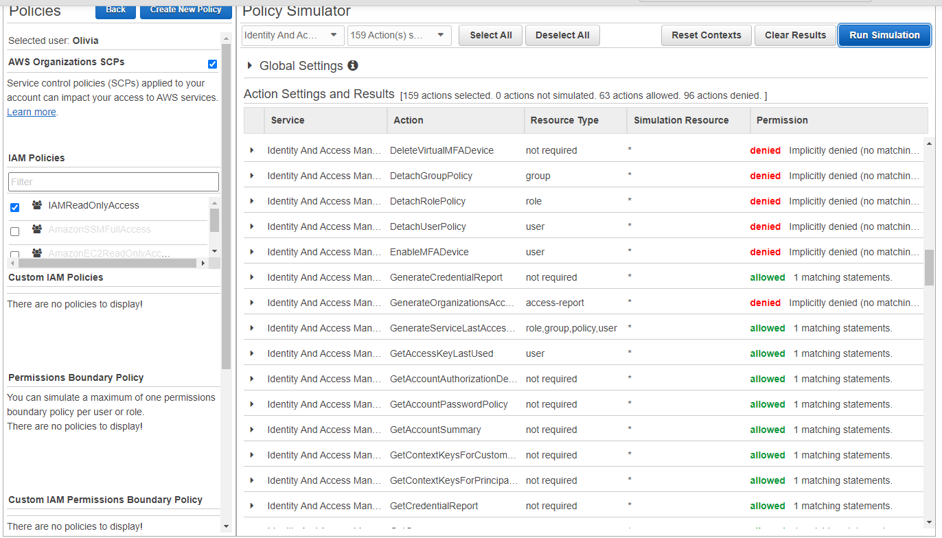 33. Policy Simulator 섹션에서 Identify and Access Management 필터로 검색 (select all)