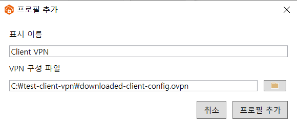 --cert "C:\\test-client-vpn\\client1.domain.tld.crt" #클라이언트 인증서의 cert 경로 추가