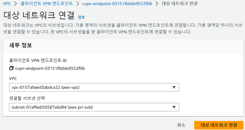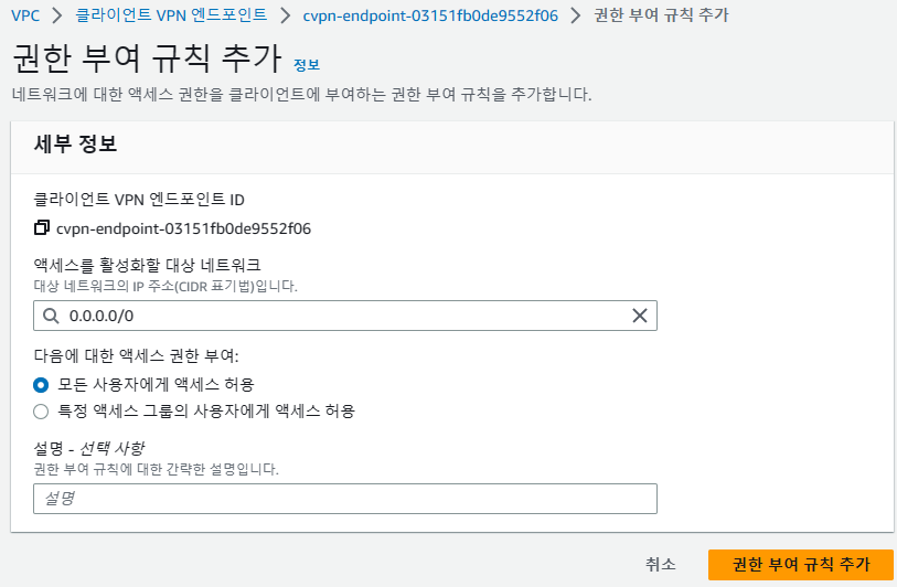 - 주소 범위는 대상 네트워크 범위 / VPC 주소 범위 / 클라이언트 VPN 엔드포인트와 연결될 경로와 중첩될 수 없다.
