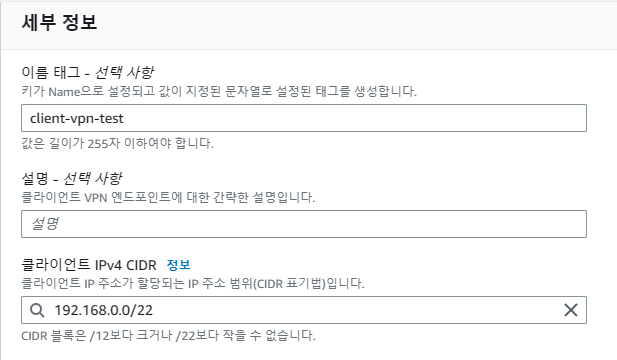 Client VPN 엔드포인트 : 클라이언트 IP 주소가 할당되는 IP 주소 범위(CIDR 표기법)