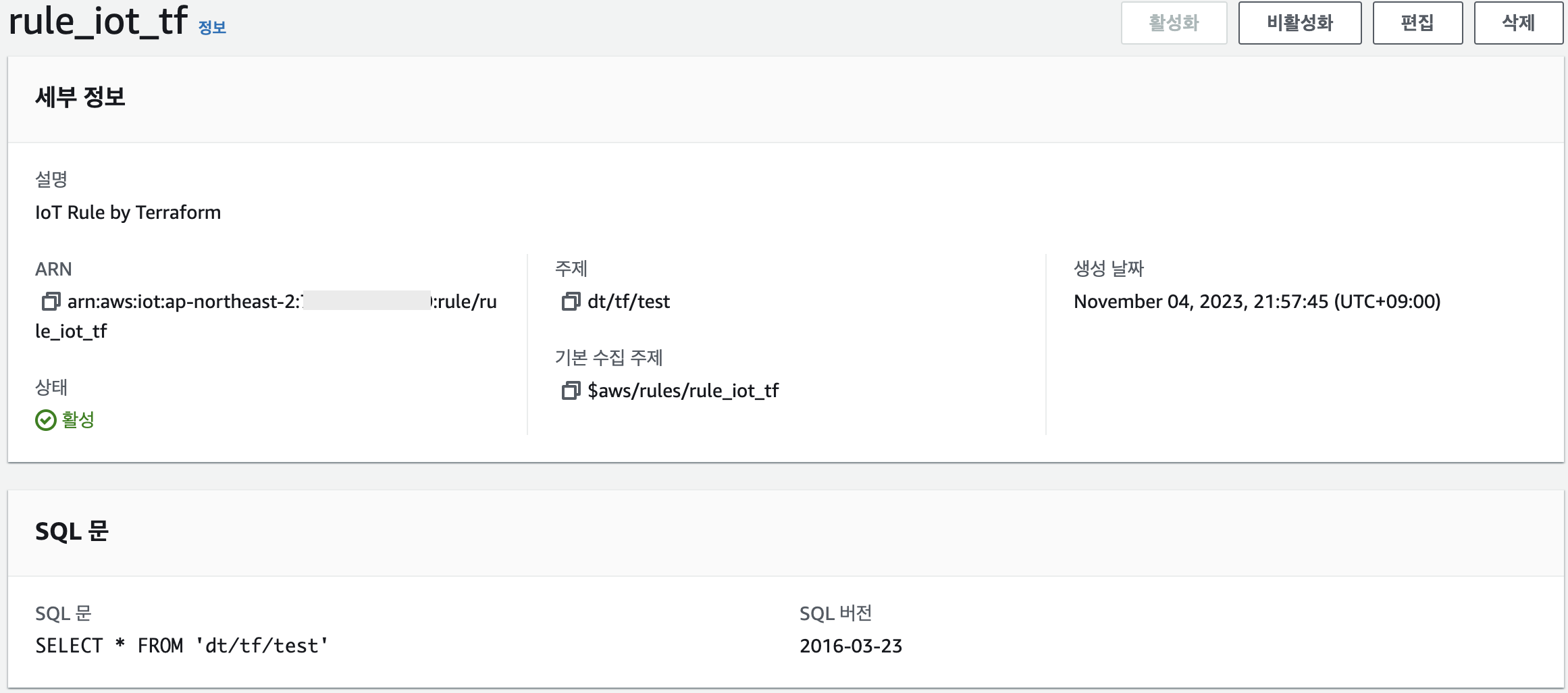 - 위에서 정의한 Thing의 arn을 통해 region 값, account 값 그리고 ThingName을 찾을 수 있다