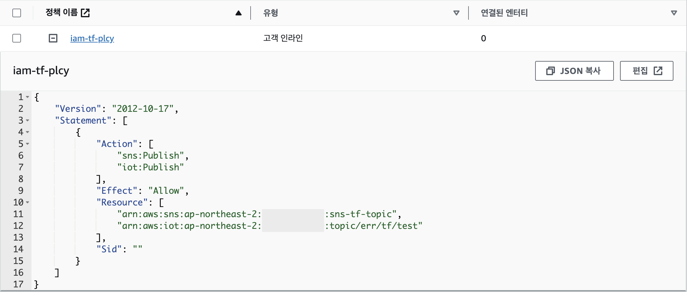 - IAM Policy(정책)에는 SNS와 IoT에 메시지를 Publish 할 수 있도록 한다. 위에서 생성한 SNS를 목적지로 설정한다