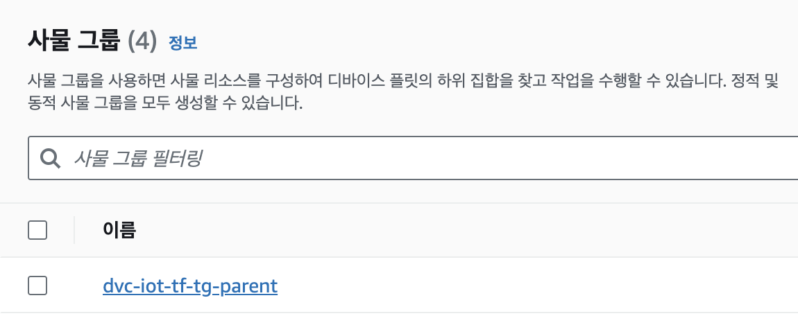 상위에 dvc-iot-tf-tg-parent라는 사물 그룹을 생성하고, 하위에 dvc-iot-tf-tg-child라는 사물 그룹을 생성한다.
