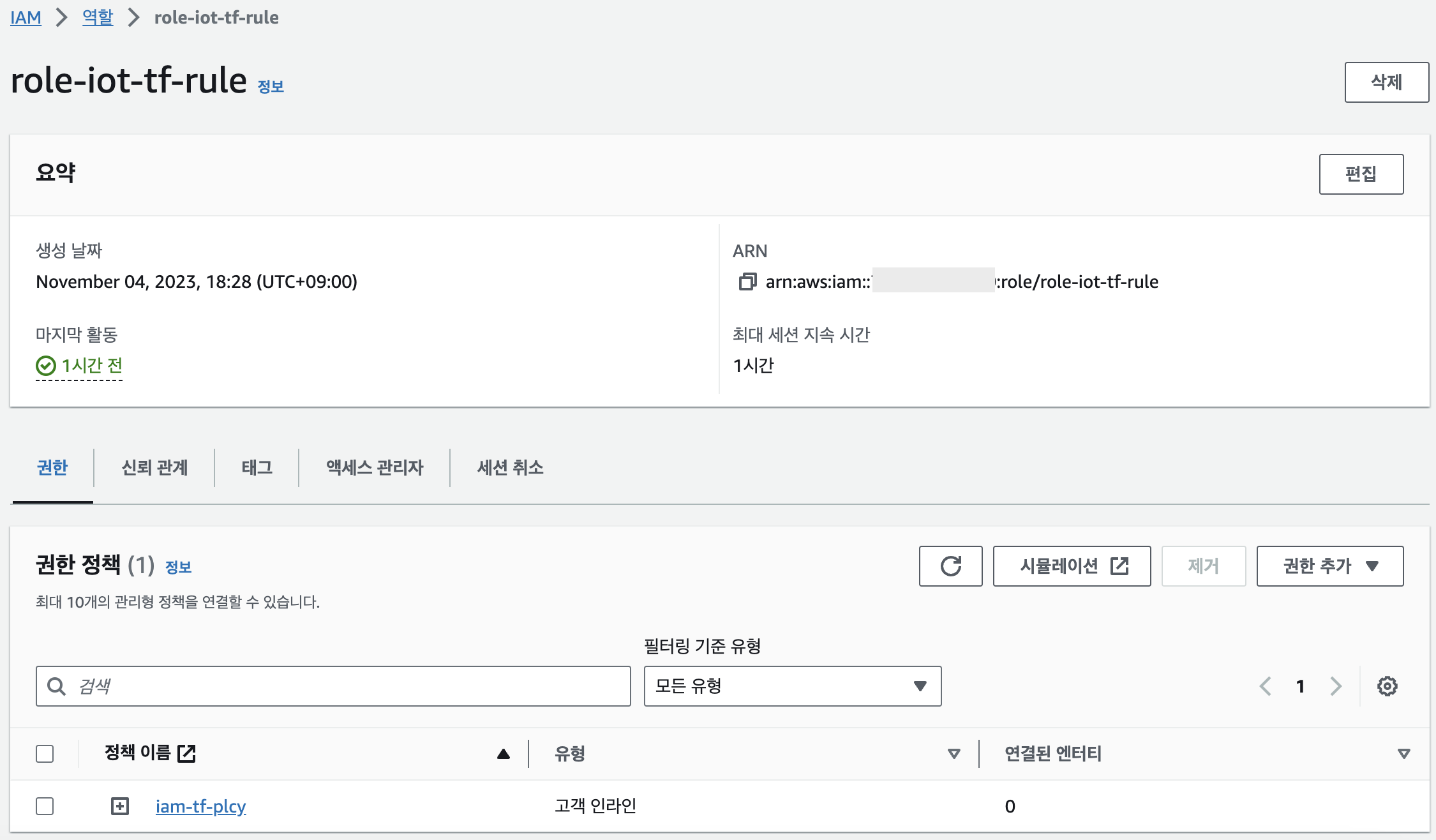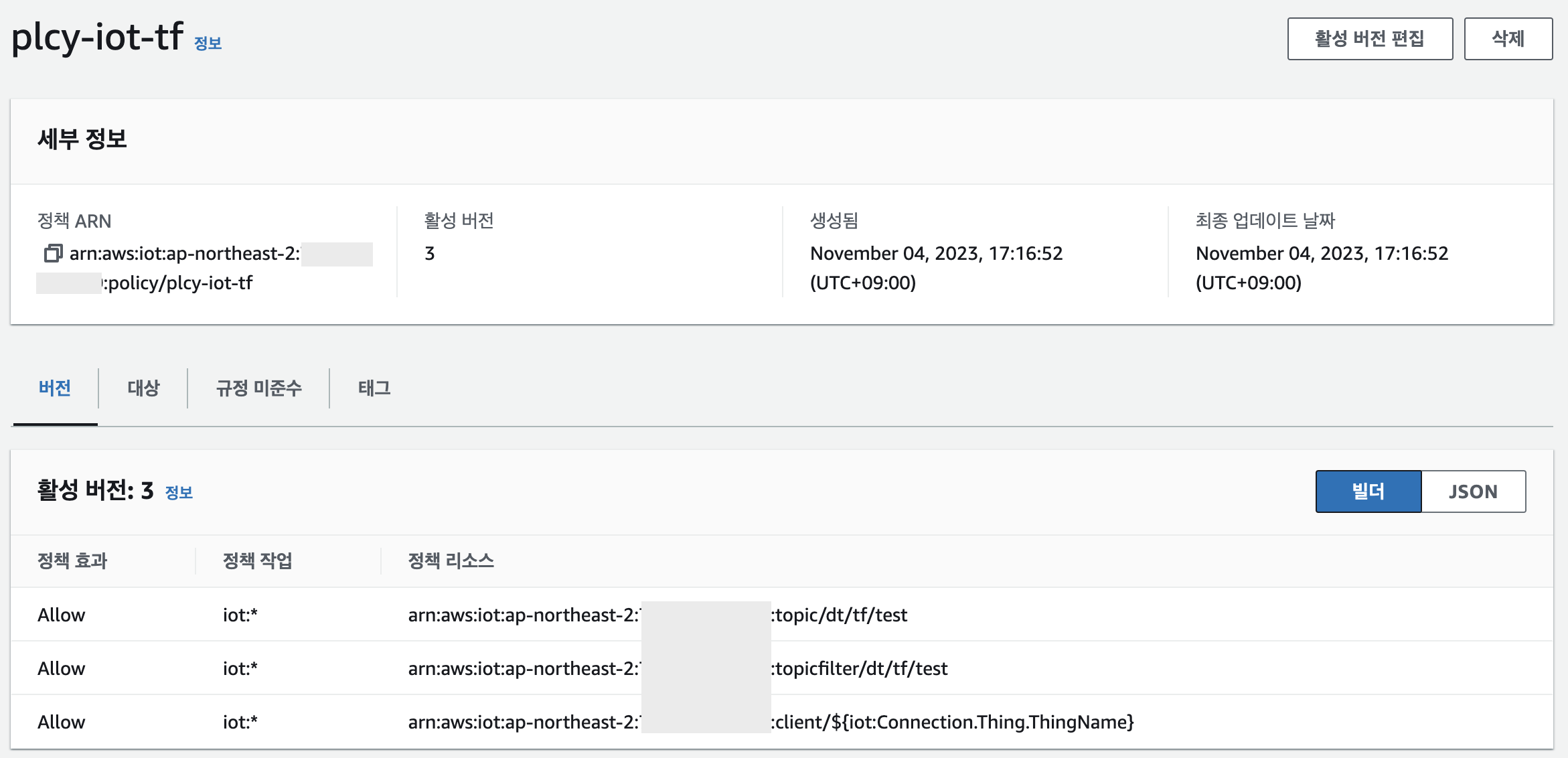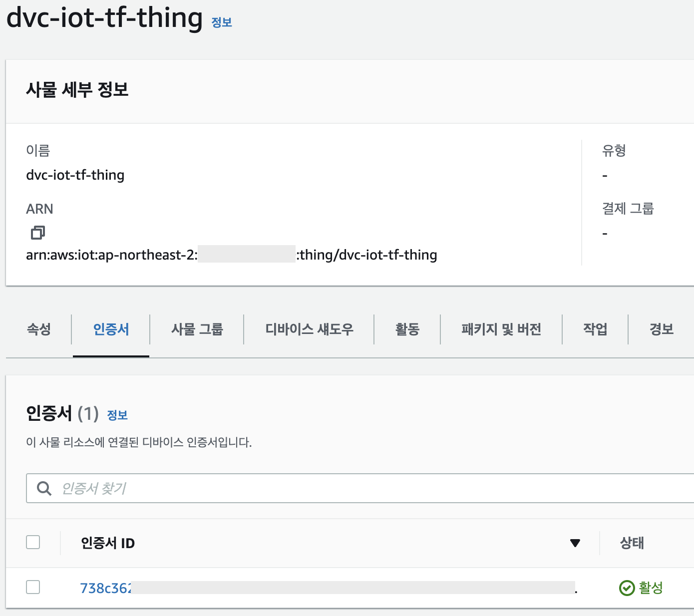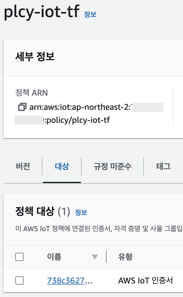 - 위에서 정의한 Thing의 arn을 통해 region 값, account 값 그리고 ThingName을 찾을 수 있다
