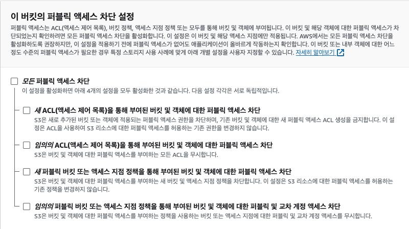 - S3를 생성할 때 다음과 같이 퍼블릭 액세스를 제어할 수 있다.