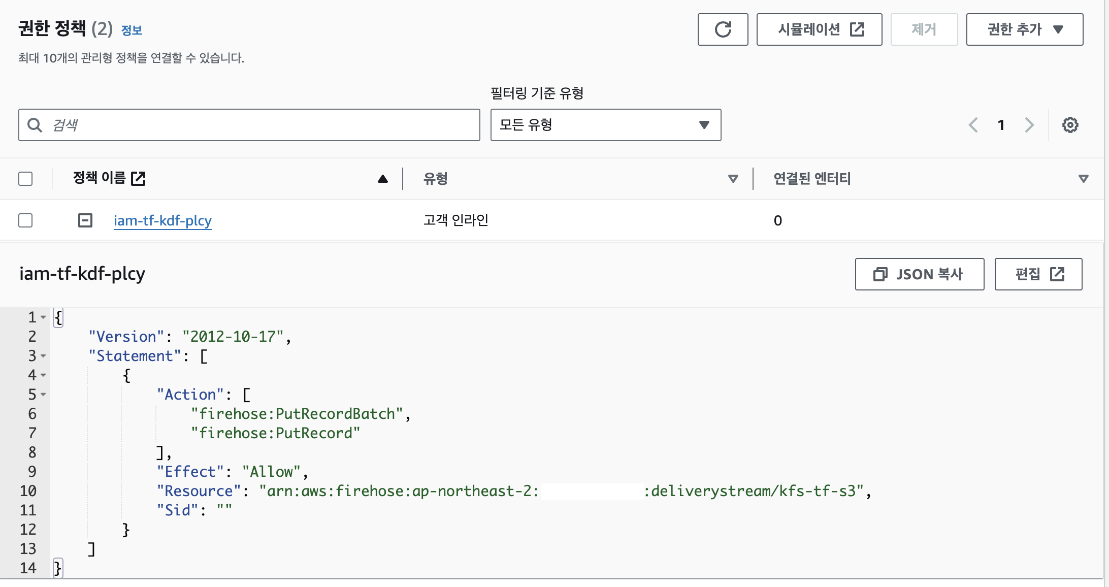 - Kinesis Firehose에 데이터를 Put 할 수 있는 정책을 가지고 있으면 된다.