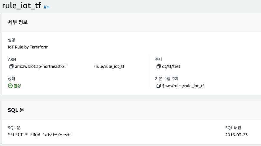 [Terraform] 테라폼으로 AWS IoT 구성하기(Thing, Policy, Rule) (0) | 2023.11.05 |