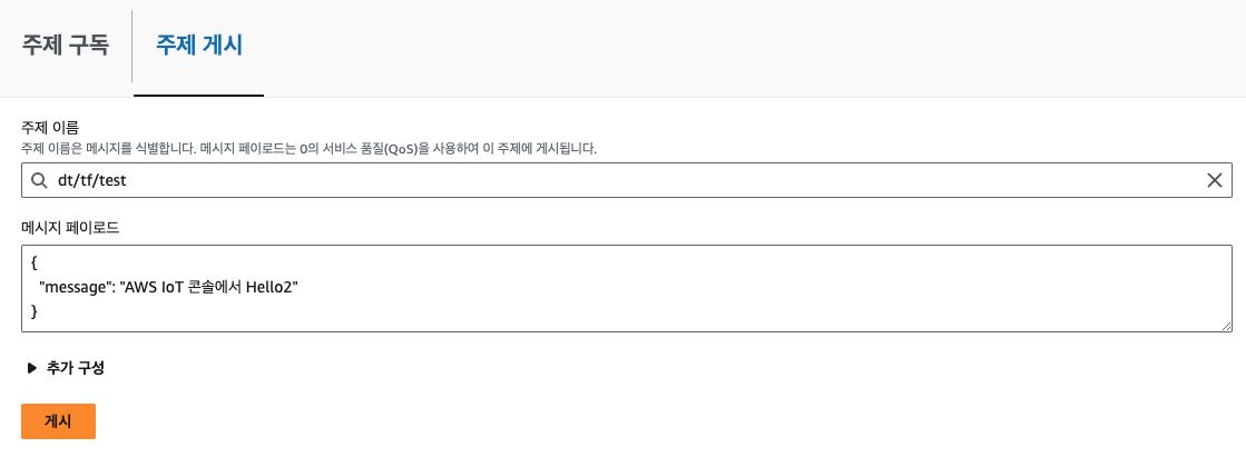 - dt/tf/test Topic으로 메시지를 게시한다.