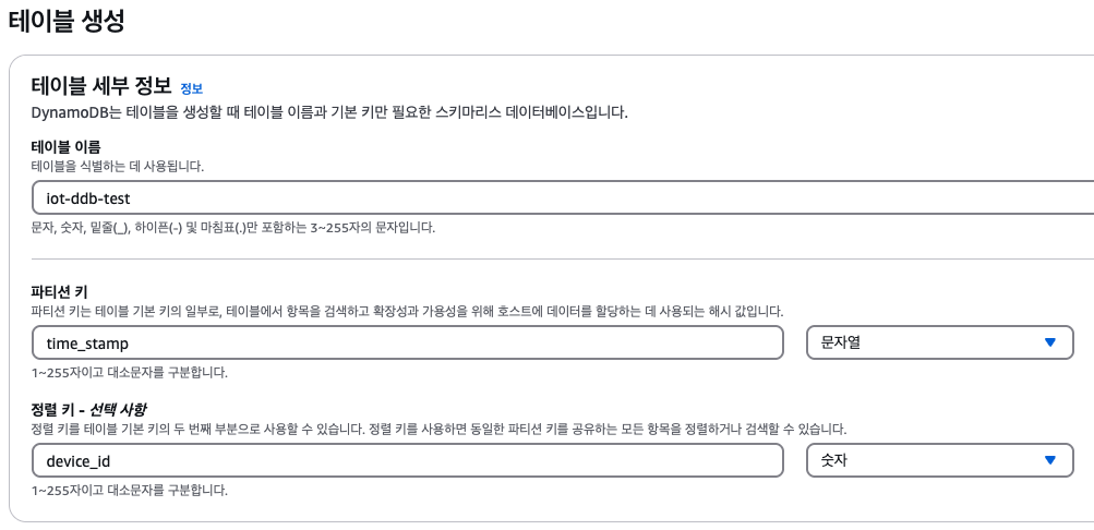 - 정렬 키 : 시간, 상태, 다른 세부 데이터를 기준으로 파티션 내에서 고유하게 구분하거나 정렬하는 데에 사용