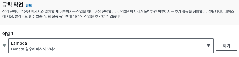 3. 규칙 작업 에선 Lambda 함수에 메시지 보내기를 선택한다. (함수 생성 방법까진 안 알려줄 거임)