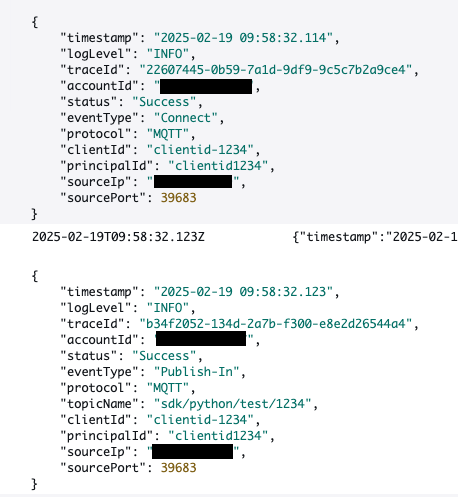3. AWSIotLogsV2 로그에서 볼 수 있듯이 연결이 허용된 것을 확인할 수 있다.