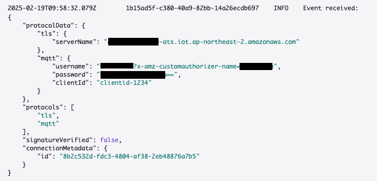 5. IoT Core는 Lambda 함수의 인증 결과(즉, 반환된 정책)에 따라 디바이스를 연결 또는 거부 한다.