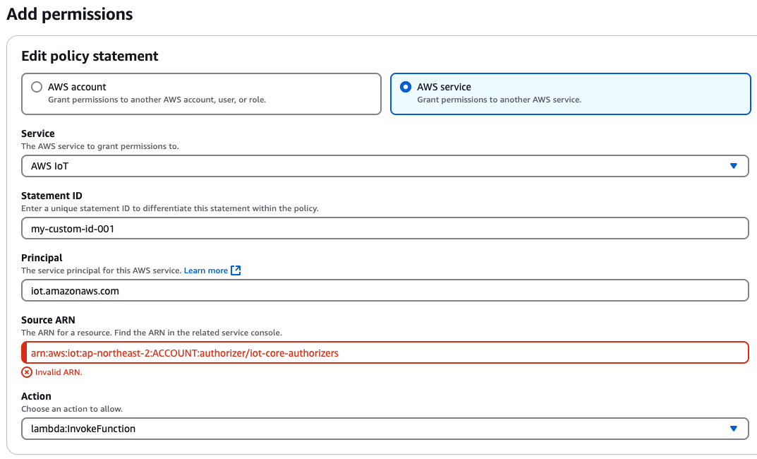Resource: ["arn:aws:iot:ap-northeast-2:ACCOUNT:client/${iot:ClientId}"]
