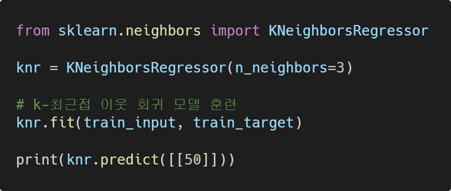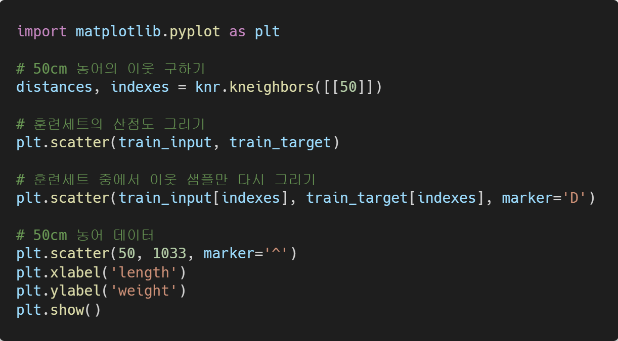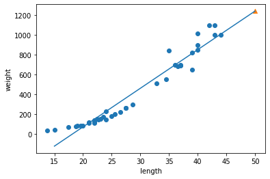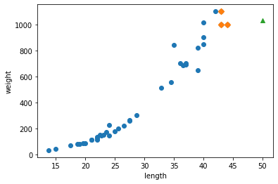 산점도를 보면 길이가 커질수록 농어의 무게가 증가하지만, 50cm 길이의 농어에서 가장 가까운 데이터는 45cm 근방이기 때문에 k-최근접 이웃 알고리즘은 이 샘플들의 무게를 평균한다