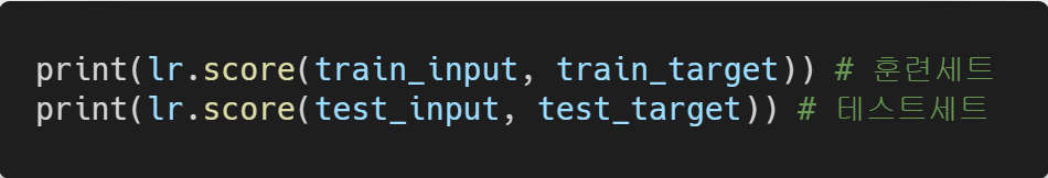 훈련세트와 테스트세트에 대한 결정계수(R^2) 점수를 확인해보자