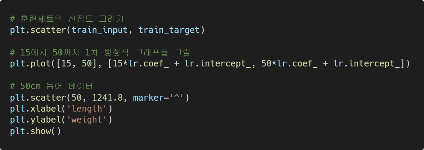 산점도를 통해 훈련 세트 범위를 벗어난 농어의 무게도 예측할 수 있음을 알게되었다