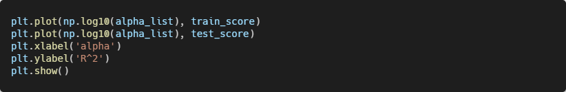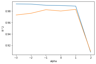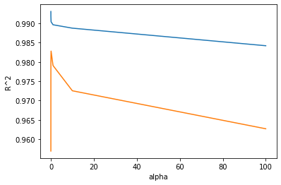 여기에선 적절한 alpha 값을 찾기 위해 alpha 값에 대한 R^2값의 그래프를 그려보는 것이다.