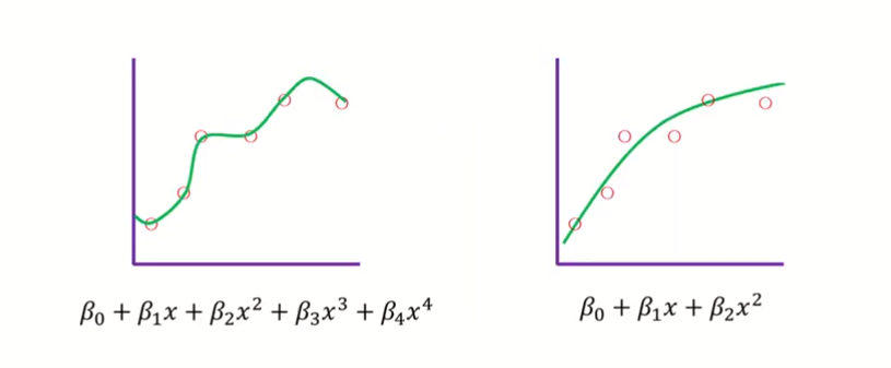 왼쪽은 훈련세트를 과도하게 학습했고, 오른쪽은 기울기를 줄여서 보편적인 패턴을 학습하고 있다