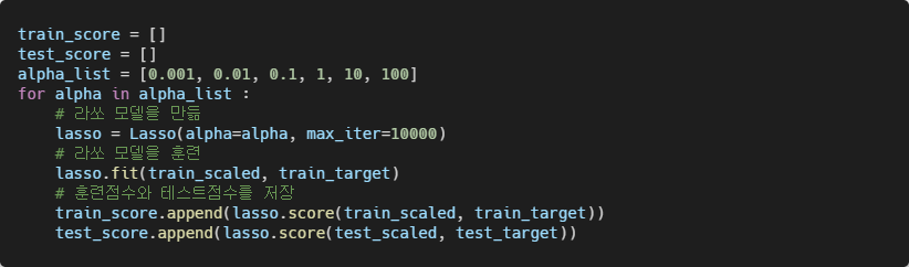 맷플롯립을 임포트하고 alpha 값을 바꿀 때마다 score() 메서드의 결과를 저장할 리스트를 만든다.