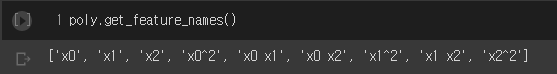 poly.get_feature_names()를 통해 9개의 특성이 어떻게 만들어졌는지 확인할 수 있다.