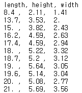 >> 여기에서는 농어의 길이, 높이, 두께 사용!