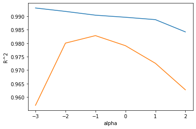 여기에선 적절한 alpha 값을 찾기 위해 alpha 값에 대한 R^2값의 그래프를 그려보는 것이다.