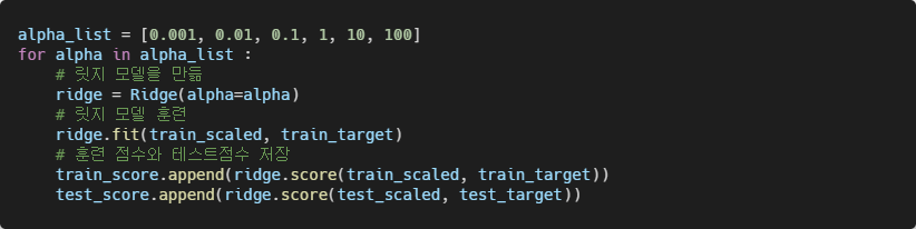 alpha 값을 0.001에서 100까지 10배씩 늘려가며 릿지 회귀 모델을 훈련한 다음 훈련세트와 테스트세트의 점수를 리스트에 저장한다.