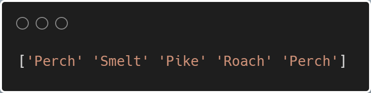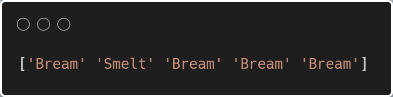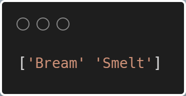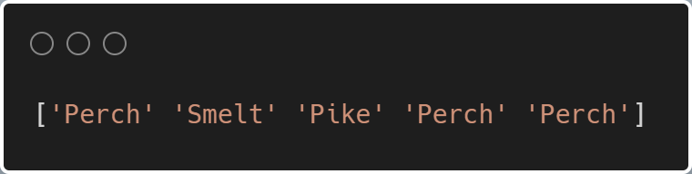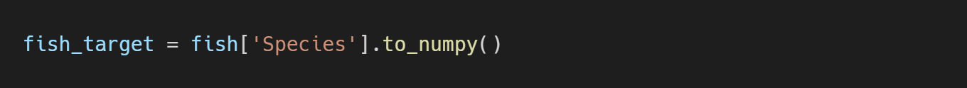 타깃 데이터를 만들기 위해 위와 동일한 방법으로 Species열을 선택하여 넘파이 배열로 바꾸고 이를 fish_target에 저장했다.