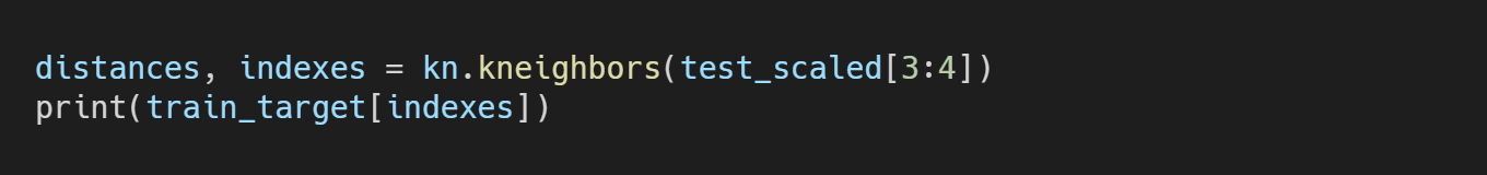 이 모델이 계산한 확률이 가장 가까운 이웃의 비율이 맞는지 확인하기 위해 네 번째 샘플의 최근접 이웃의 클래스를 확인해본다.