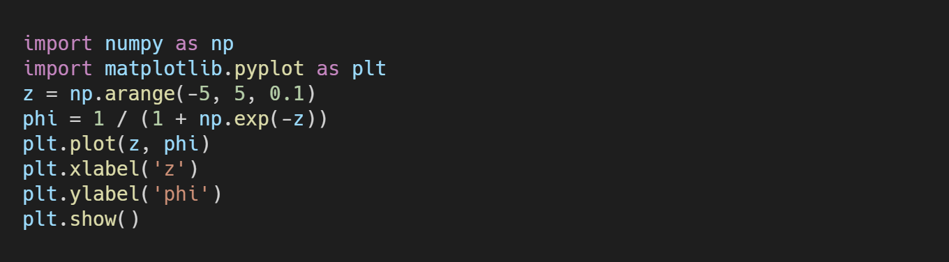 넘파이를 이용해 -5와 5 사이에 0.1 간격으로 배열 z를 만든 다음 z 위치마다 시그모이드 함수를 계산한다.