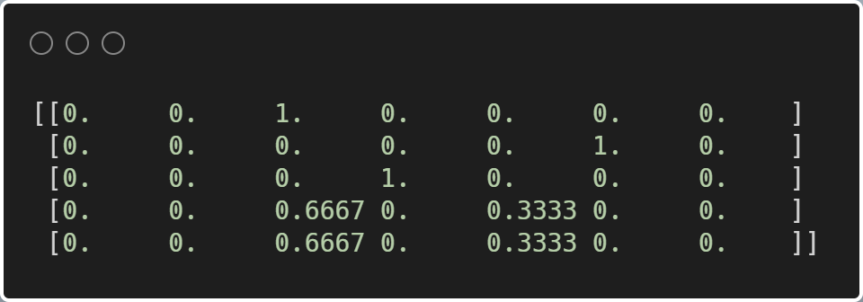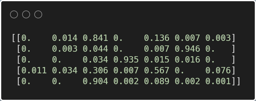 5개의 샘플에 대한 예측이므로 5개의 행이 출력되었다. 7개 생선에 대한 확률을 계산했으므로 7개의 열이 출력되었다.