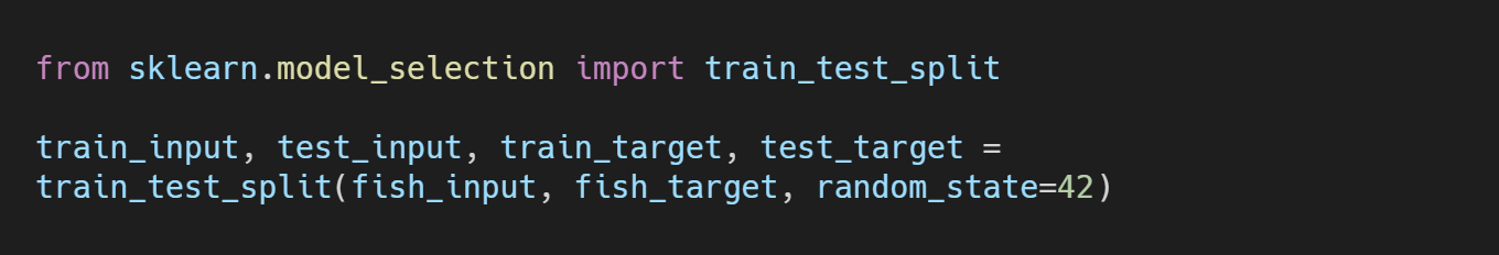 입력 데이터로 사용하기 위해 데이터프레임에서 원하는 열을 리스트로 나열해 선택한다. 여기에서는 5개의 열을 선택해서 to_numpy() 메서드로 넘파이 배열로 바꾸었다. 그리고 이것을 fish_input에 저장했다.