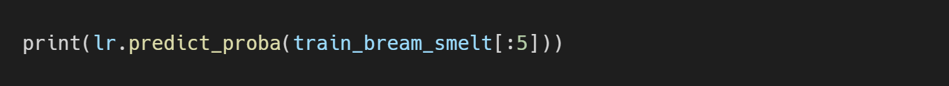 두 번째 샘플을 제외하고 모두 도미로 예측했다. KNeighborsClassifier와 마찬가지로 predict_proba() 메서드를 통해 train_bream_smelt에서 처음 5개 샘플의 예측 확률을 출력해보자